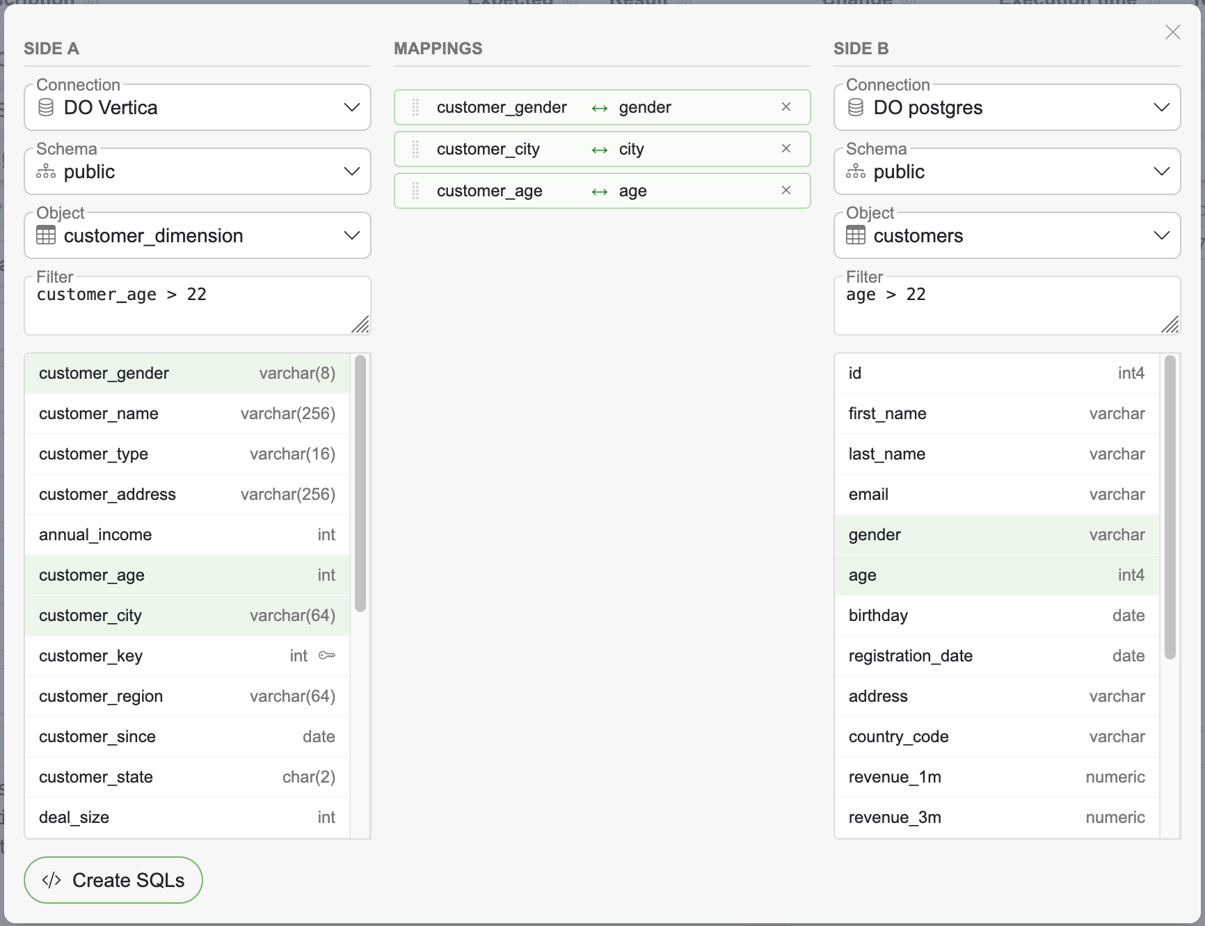 Select the connection, schema, and object for both sides (A and B)