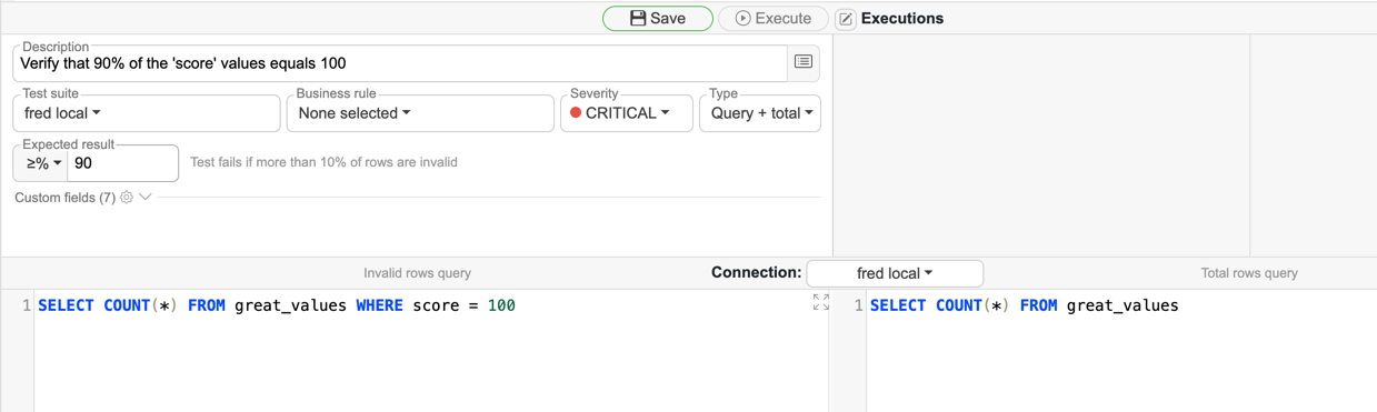 Query + total test cases let you define two separate SQL queries — one returning the invalid (failing) row count and one returning the total row count. DQM executes both and calculates the result automatically.